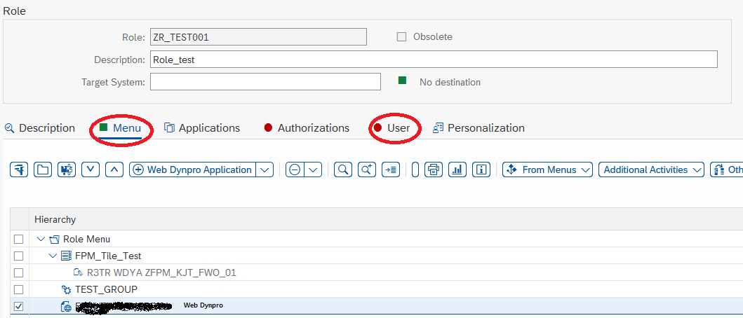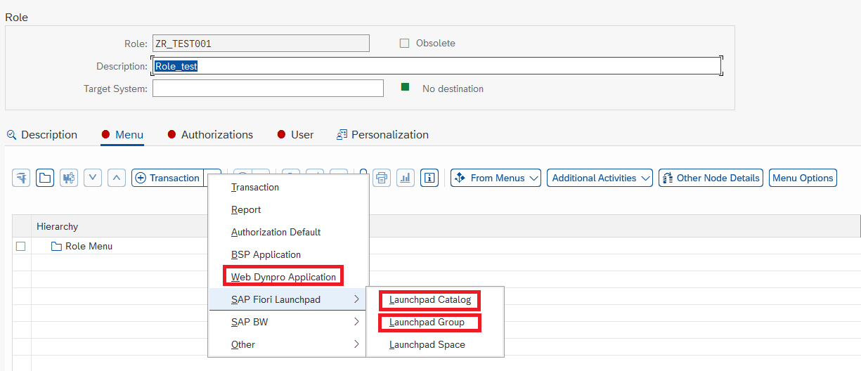 Role을 생성하면 Transaction에서 Web Dynpro Application / Launchpad Catalog / Launchpad Group을 선언해 준다.