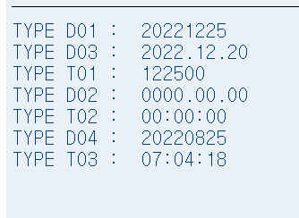 | D | Date(YYYY.MM.DD) | '00000000' |
