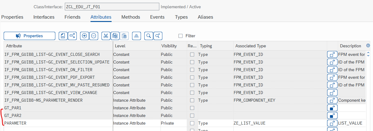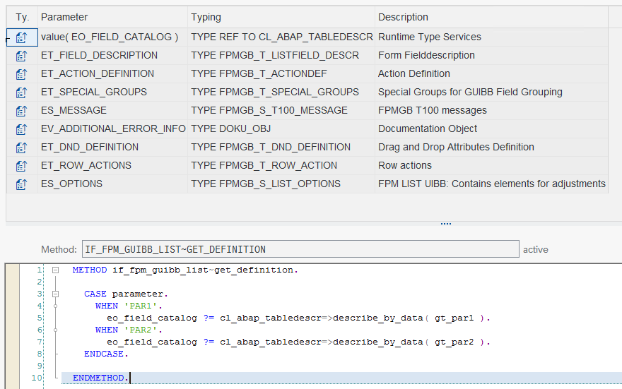 IF_FPM_GUIBB 인터페이스는 GET_PARAMETER_LIST와 INITALIZE 메소드를 가지고 있습니다. 이 메소드들이 동적인 필드 카탈로그를 만드는 데 사용되는데 먼저 GET_PARAMETER_LIST입니다.