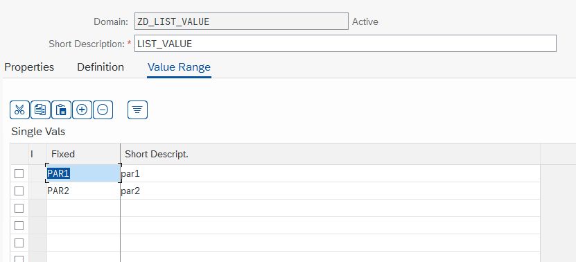 저는 두개의 Fixed Value를 가진 Character 10자리 타입의 도메인(ZD_LIST_VALUE)을 생성했으며, ZE_LIST_VALUE 라는 Element에서 생성한 도메인을 사용하고 있습니다.
