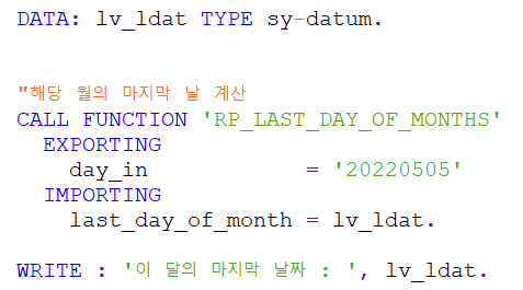 3) CALL FUNCTION 'PR_LAST_DAT_OF_MONTHS'를 입력하고 ctrl + space bar를 눌러 자동완성시킨다. ( 직접 입력해도 상관없음 )