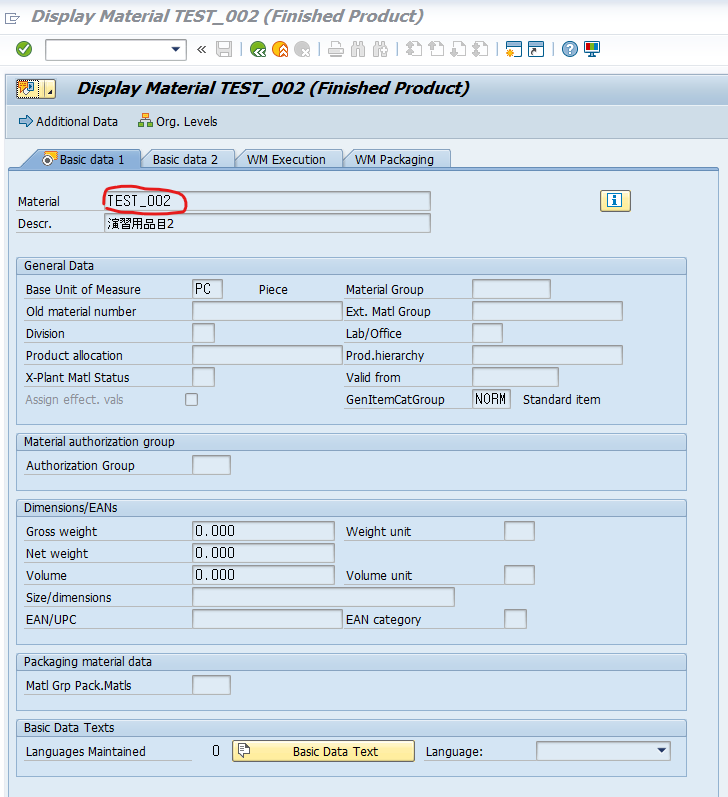 프로그램을 실행시키면 TEST_002라는 자재의 정보를 바로 확인할 수 있습니다.