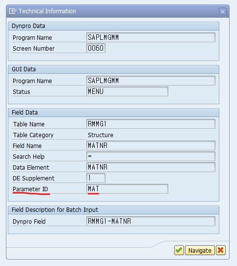 자재마스터 조회 프로그램인 MM03은 'MAT'라는 Parameter ID를 가지고 있습니다.