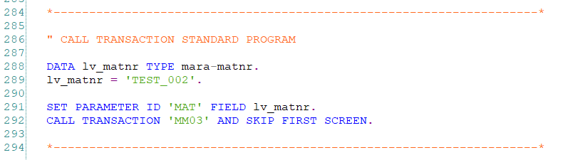 만약 AND SKIP FIRST SCREEN 구문을 통해 자재번호를 입력하여 실행화면을 호출하고 싶을 때는 PARAMETER ID를 SET 해주면 됩니다.