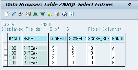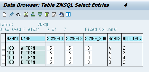 위에서 만든 ZNSQL 테이블에서 NAME, SCORE01, SCORE02 데이터를 추출하고 SCORE_SUM 테이블 데이터를 상황에 맞게 데이터를 입력한다.